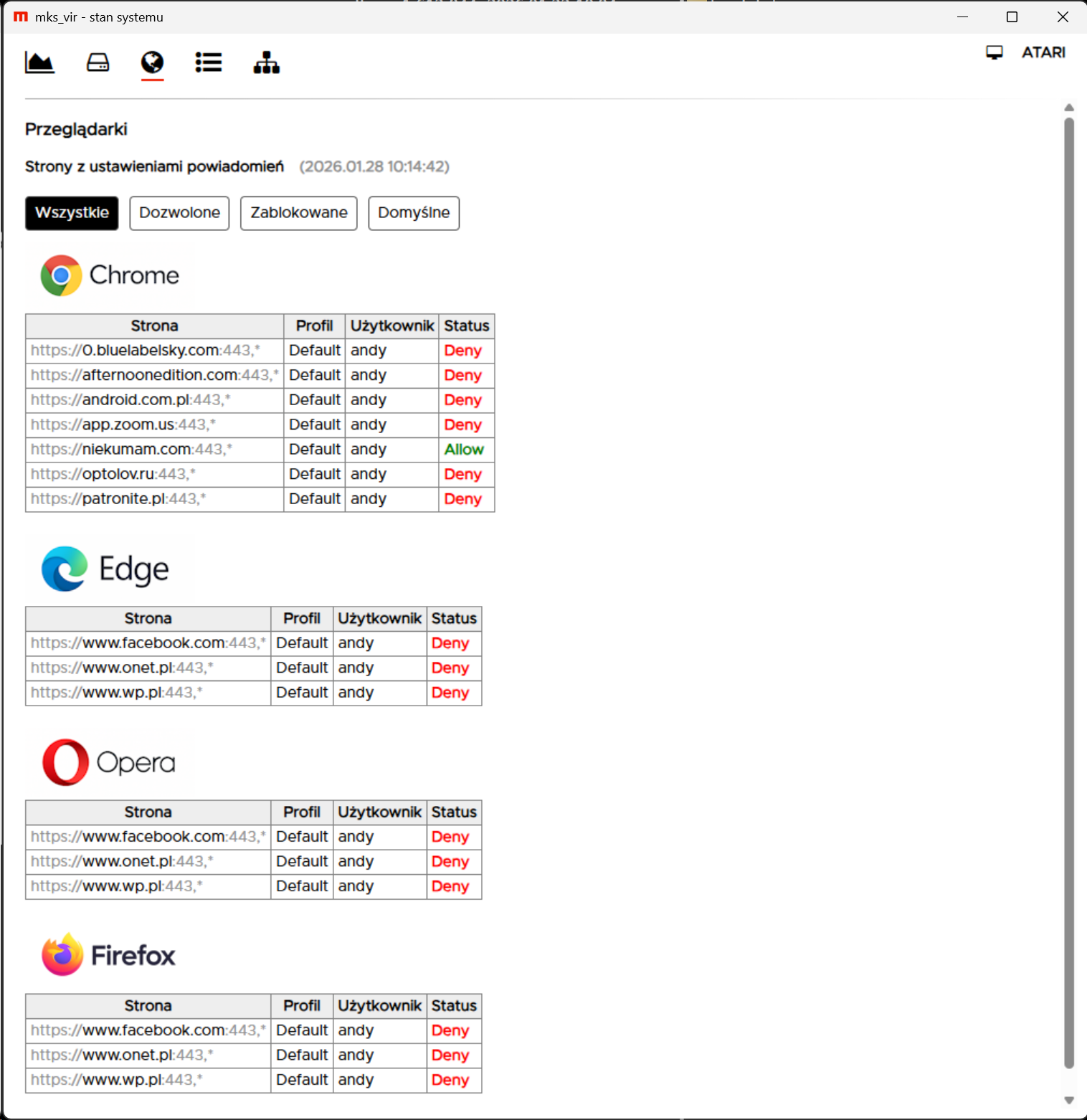 Moduł Stan Systemu uzupełniono też o mechanizm prezentujący wykaz witryn posiadających uprawnienia do wysyłania powiadomień systemowych. Rozwiązanie to ma ograniczać nadużycia związane z agresywną reklamą, fałszywymi alertami o zagrożeniach i próbami oszustw. Użytkownik zyskuje możliwość szybkiego sprawdzenia źródeł powiadomień i łatwiejszego wychwycenia podejrzanych serwisów: