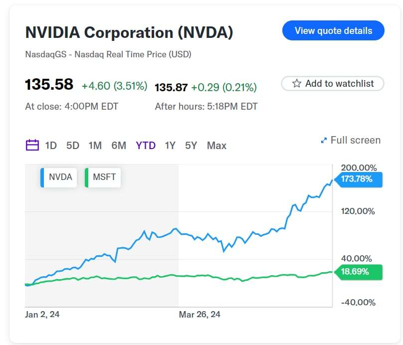 Akcje Nvidia od 1 stycznia 2024 vs akcje Microsoftu od 1 stycznia 2024. Źródło: YahooFinanceNvidia nie mówi ostatniego słowa
