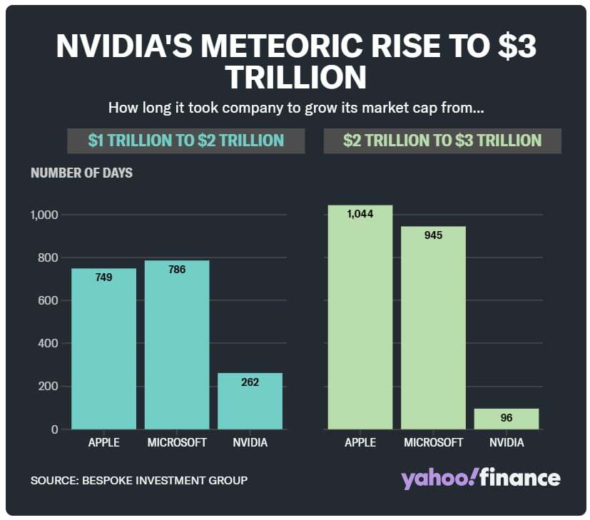 Wzrost kapitalizacji rynkowej Nvidia na tle Microsoftu i Apple. Źródło: YahooFinanceNvidia po raz pierwszy przekroczyła kapitalizację rynkową w wysokości 1 biliona dolarów dokładnie 13 czerwca 2023 roku. Od tego czasu wycena spółki przekroczyła 2 biliony dolarów niedawno… Dokładnie 1 marca, po to by już 5 czerwca być wyceniona na poziomie 3 bilionów dolarów. Wzrost z 1 biliona do 3 bilionów dolarów, ani Apple ani Microsoftowi nie zajął tak krótko. W przypadku Nvidia wszystko dzieje się w ekspresowym tempie. Wszystko to przypomina jakiś sen, w którym inwestorzy błąkają się, nie wiedząc jak wycenić spółkę, której kupują akcję. W efekcie jej walory wzrosły o ponad 215% w ciągu ostatnich 12 miesięcy … I przeszło 3400% w ciągu ostatnich pięciu lat. Od 1 stycznia 2024 roku Nvidia zyskała 175%. W tym samym czasie akcje Microsoftu wzrosły niecałe 19% w 2024 roku… Co wydaje się świetnym wynikiem – jednak wciąż bladym na tle Nvidia. Każda wyprzedaż cen akcji kończy się błyskawicznym powrotem kupujących.