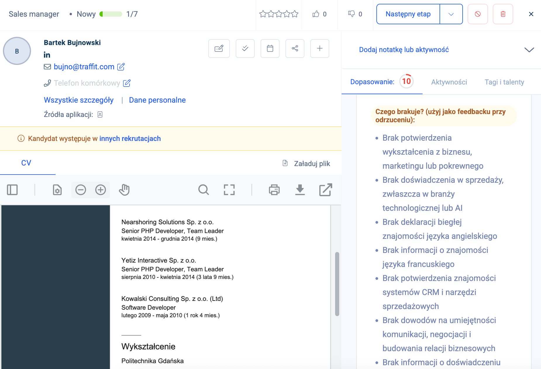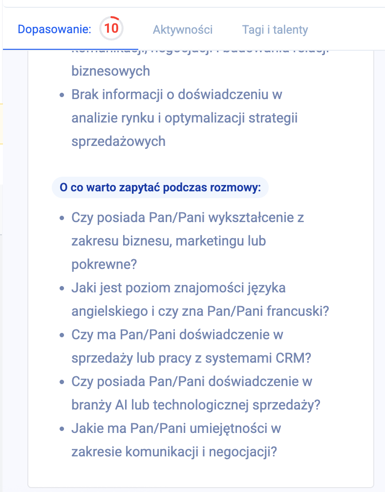AI nie tylko ocenia, ale też pomaga prowadzić rozmowę. o ile kandydat ma przerwę w doświadczeniu lub niejasny zakres obowiązków – system zaproponuje konkretne pytania do rozmowy lub maila.
