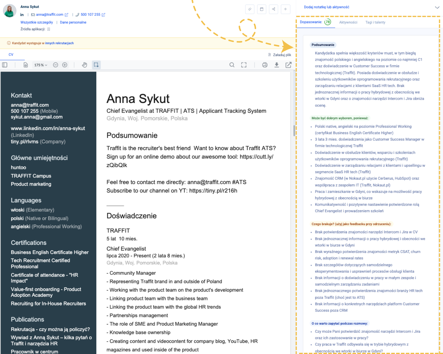 W Traffit, AI nie tylko ocenia dopasowanie, ale też generuje pytania follow-up – np. gdy w CV widać lukę w zatrudnieniu lub brak potwierdzenia certyfikatu. To skraca czas przygotowania do rozmowy i pozwala skupić się na jakości dialogu z kandydatem.