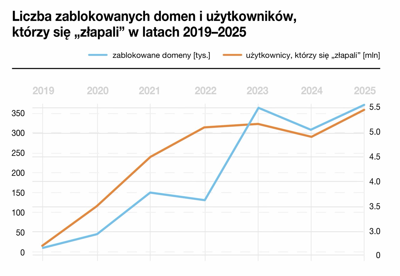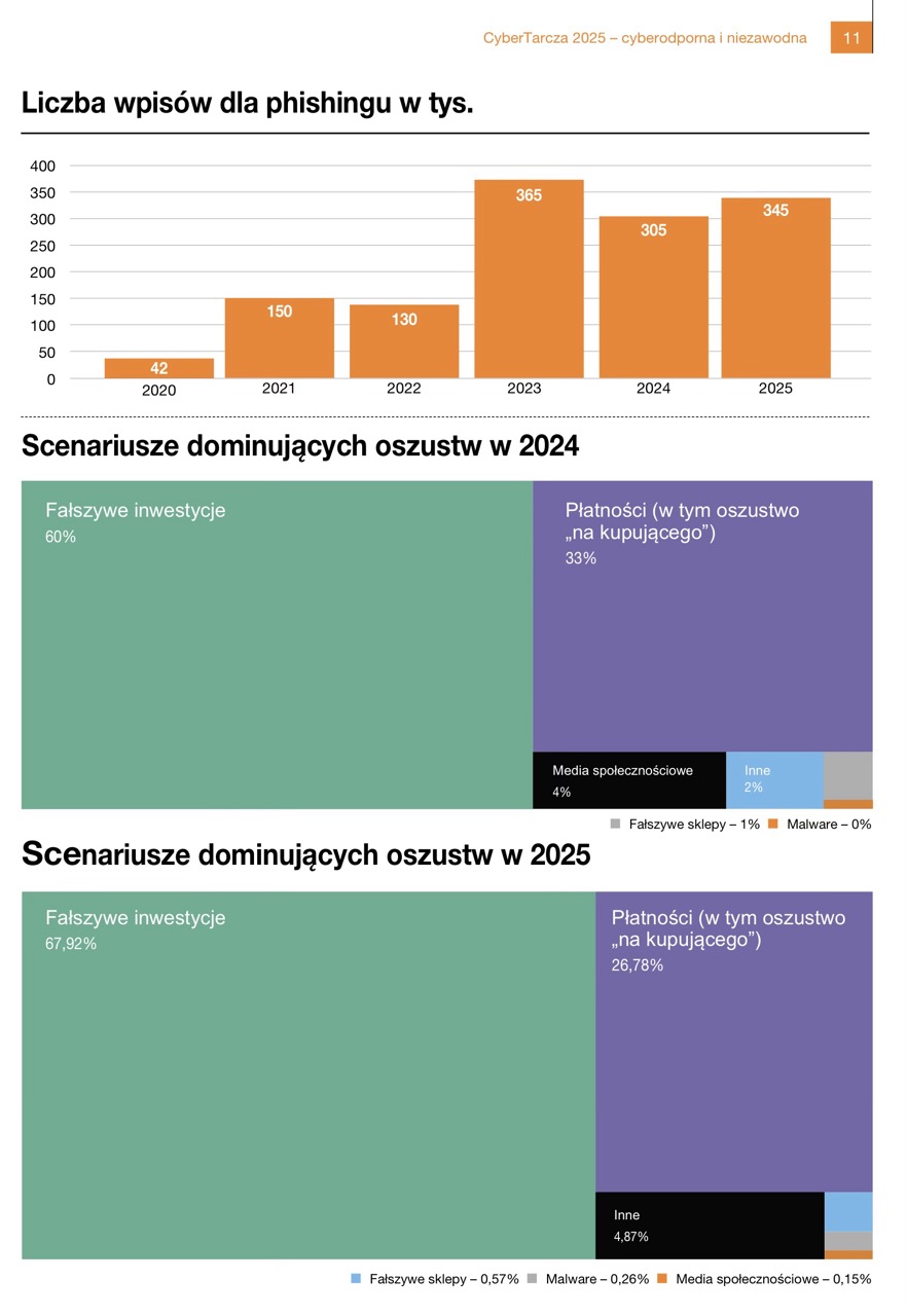 Ten trend się utrzymał. Fałszywe inwestycje jeszcze w 2023 r. stanowiły 28 proc. wszystkich wykrytych oszustw tego typu, tak w 2024 r. ten odsetek wynosił już 60 proc. W ostatnim roku ponownie wzrósł – do poziomu aż 68 proc. Incydentów nie było przy tym mało, a CERT Orange Polska poinformował, iż na przestrzeni 2025 r. zablokowano z użyciem CyberTarczy aż 345 tys. domen phishingowych.