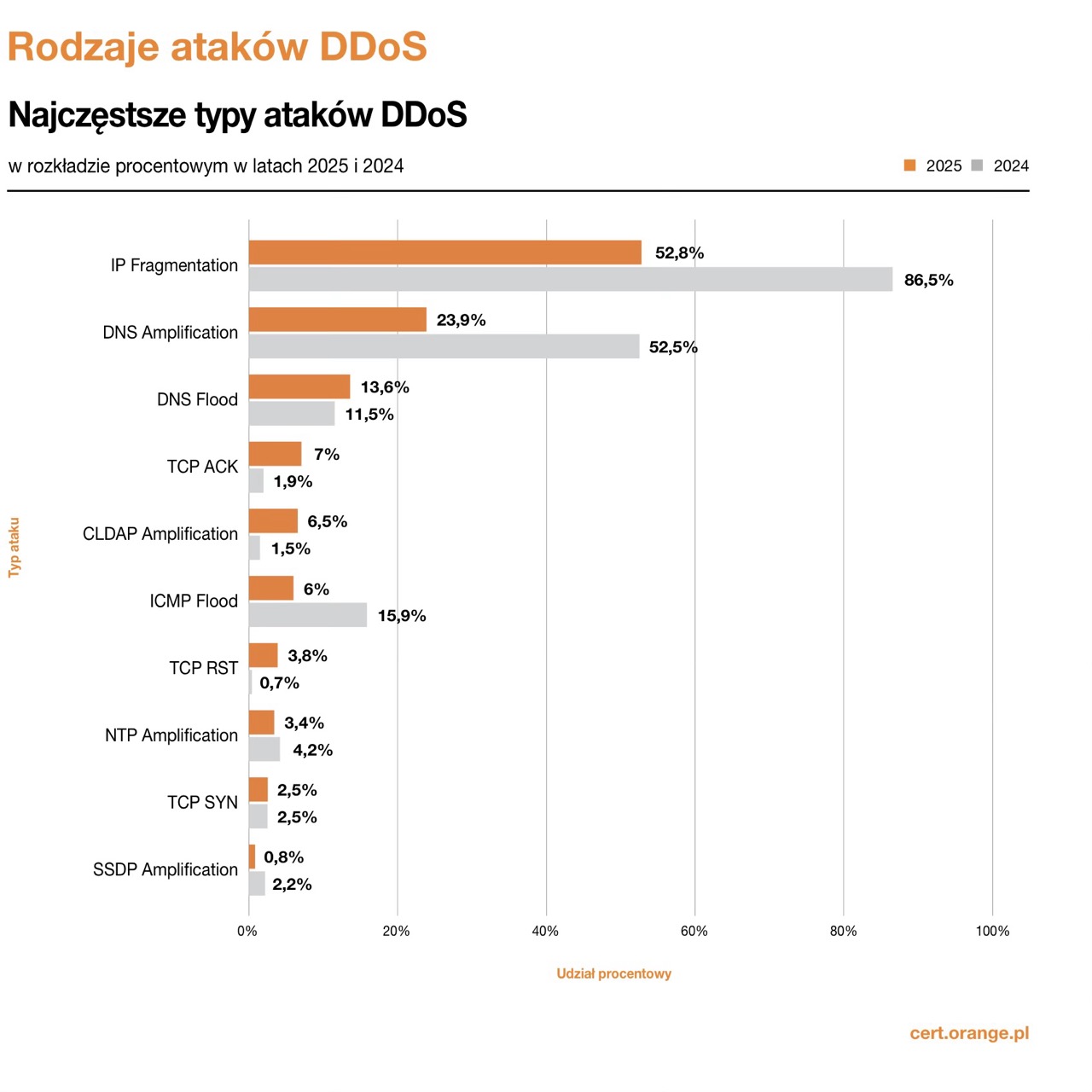 CERT Orange Polska podaje, iż ataki tego typu stają się coraz silniejsze, bardziej wyrafinowane i dopasowane, a cyberprzestępcy zajęli się „platformizacją DDoS”. Średnia wielkość natężenia ataku DDoS w 2025 r. wynosiła przy tym ponad 4,4 Gb/s (w porównaniu do ponad 7,2 Gb/s w 2024 r.), a dominują ataki o niskim poziomie krytyczności. Sklasyfikowano je w następujący sposób: