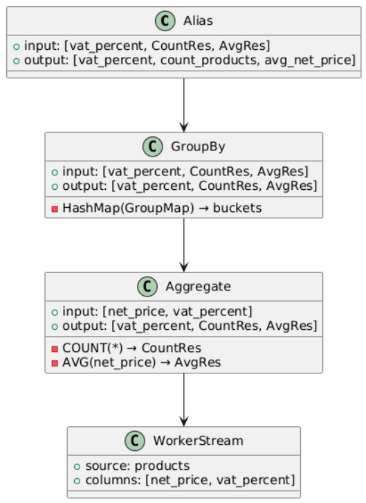 The expected consequence is simply a single-column output of gross prices, as shown in Table 2. Now, let's examine how to chain streams to produce this result. After parsing, an Abstract Syntax Tree (AST) is generated and passed to the interpreter, which builds a chain of streamers. Each streamer performs a single operation and forwards its output to the next.