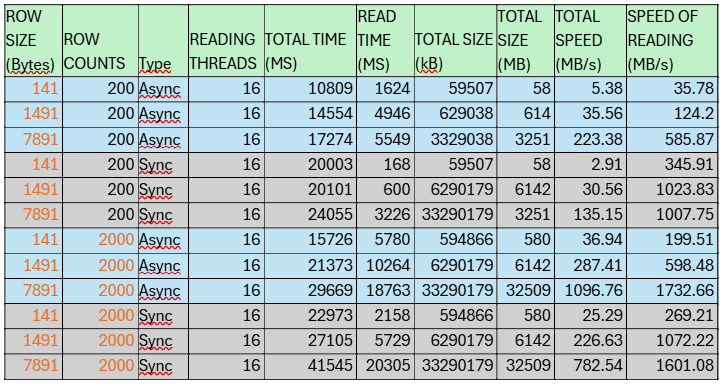 We observe that the asynchronous version exhibits importantly lower Speed of Reading, sometimes even up to 10 times slower than the synchronous approach. However, erstwhile comparing full times, the asynchronous method is only about 2 times slower for smaller chunks (e.g., 141 bytes) and around 50% slower for larger chunks. This difference stems from the fact that synchronous streaming spends most of its time initializing all 2160 workers sequentially, whereas asynchronous streaming initializes them rapidly but suffers from overhead due to frequent context switching.