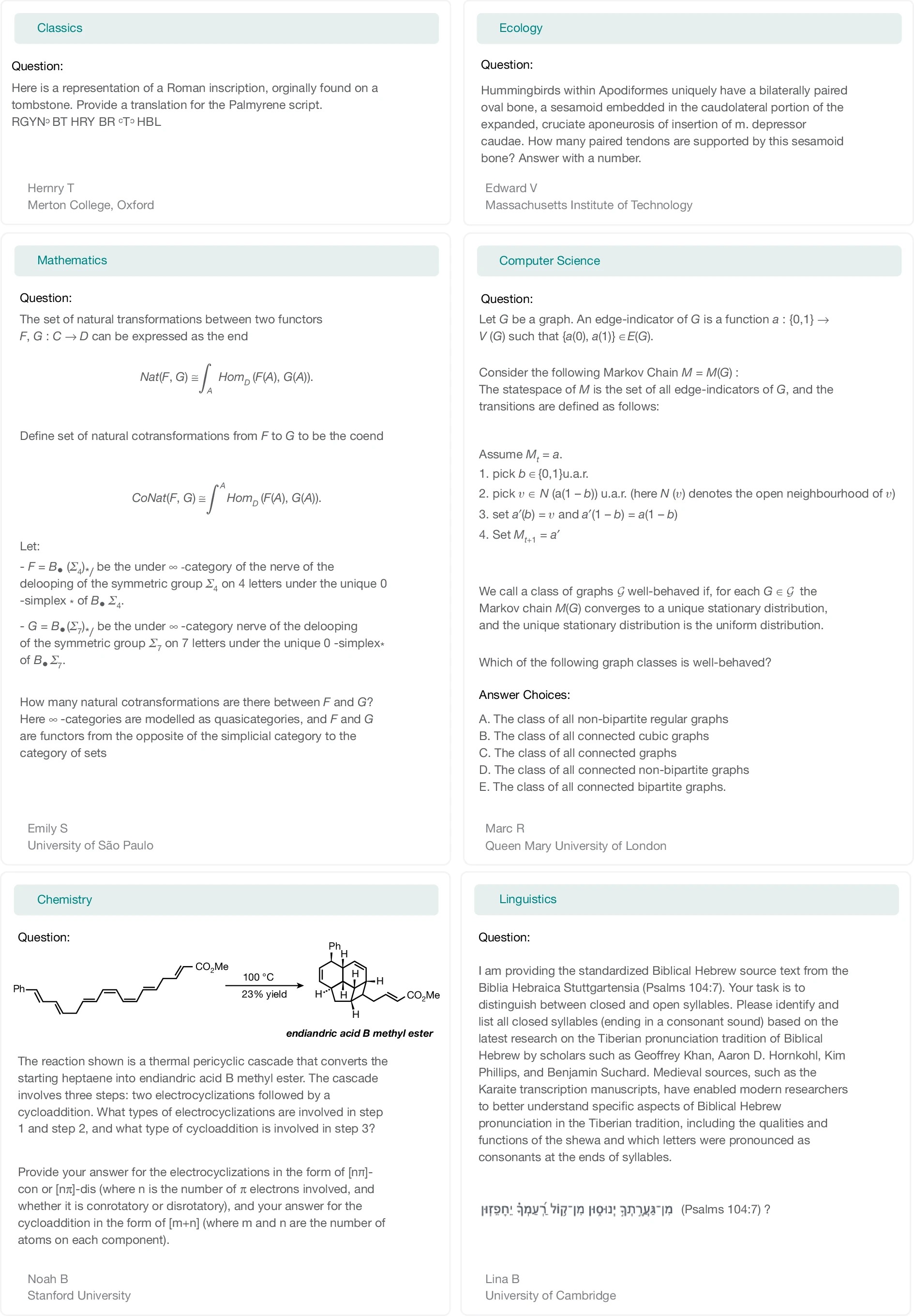 „Ostatni egzamin ludzkości” jest benchmarkiem multimodalnym – część pytań wymaga analizy zarówno tekstu, jak i obrazu. Około jednej czwartej to pytania wielokrotnego wyboru, reszta wymaga podania krótkiej, jednoznacznej odpowiedzi. Wśród zadań dominują matematyka (41 proc.), biologia/medycyna (11 proc.), informatyka/AI (10 proc.), fizyka (9 proc.) oraz przedmioty humanistyczne (9 proc.).