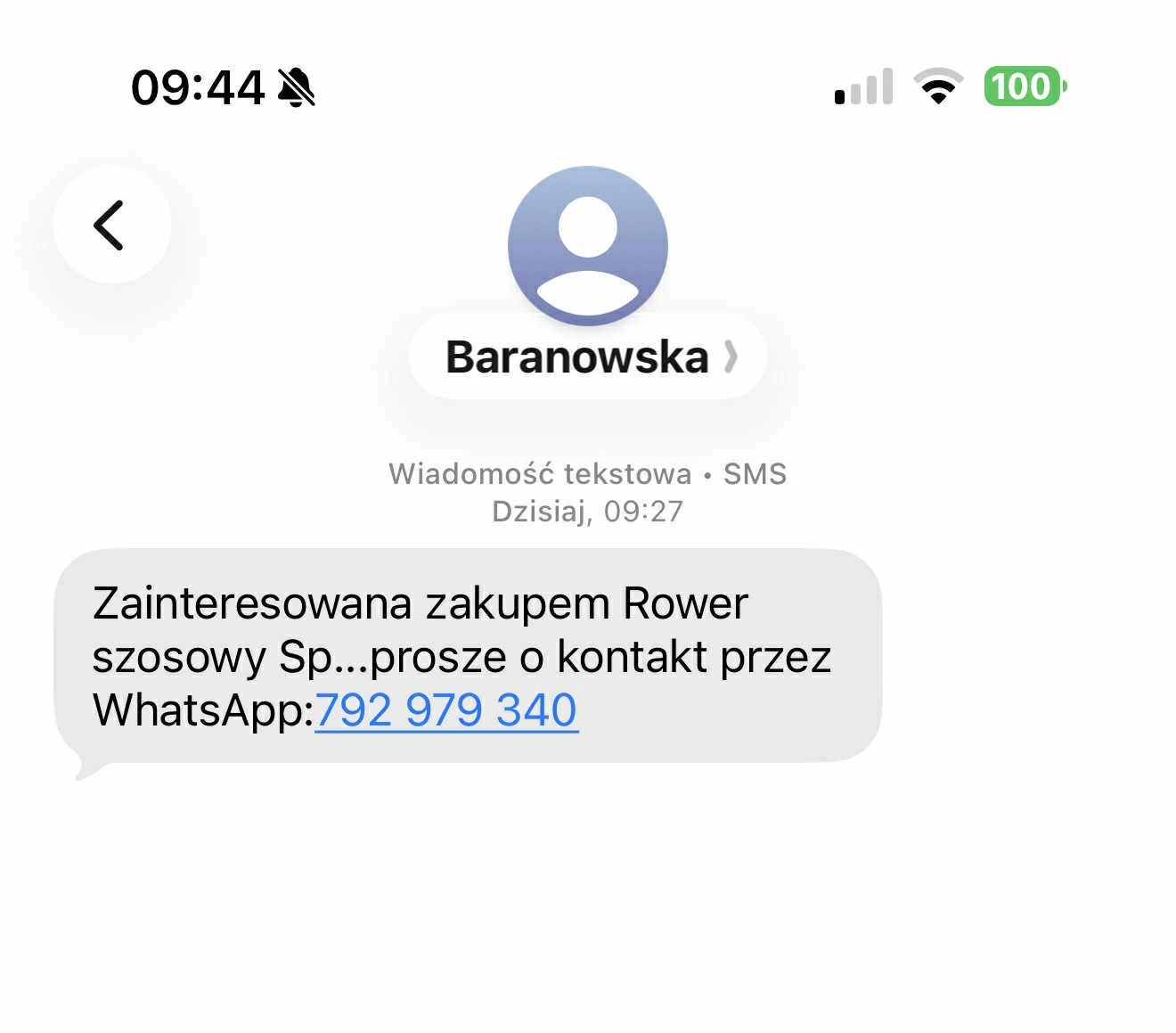 Na platformie OLX wystawiłem dziś na sprzedaż rower szosowy. Zaledwie kilka minut później otrzymałem wiadomość od nieznajomego numeru (klasyk) z identyfikatorem „Baranowska”. Identyfikator ten pozwala ukryć numer, z którego prowadzona jest wysyłka wiadomości i uwiarygodnić nadawcę jego rzekomym nazwiskiem. Treść wiadomości była już dość typowa dla oszustów: