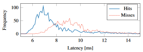 Opóźnienie podczas zdalnego ataku side-channel na pamięć podręczną stron Źródło: Page Cache Attacks (https://arxiv.org/pdf/1901.01161.pdf) |