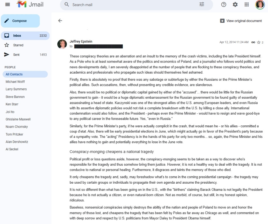 W wiadomości czytamy argumentację wykluczającą zamach, a także ostrzeżenie, iż szerzenie teorii spiskowych tanio sprzedaje narodową tragedię. Fakt, iż tak szczegółowa analiza polskiej polityki i nastrojów społecznych trafiła do skrzynki Epsteina, pokazuje, jak szerokie i nietypowe były jego zainteresowania geopolityczne. Finansista nie tylko obracał się w kręgach celebrytów, ale otrzymywał też raporty dotyczące kluczowych wydarzeń w Europie Środkowej.
