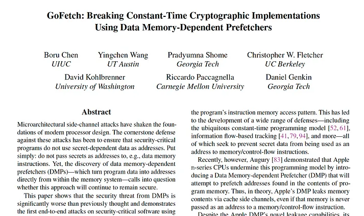 W chipach procesorów Apple wykorzystywanych m.in. w urządzeniach MacBook. iMac oraz iPad zidentyfikowano krytyczną lukę, która może potencjalnie zagrozić bezpieczeństwu milionów urządzeń na całym świecie. Międzyuczelniany zespół naukowców odkrył właśnie wektor (nazwany przez nich GoFetch), który potencjalnie umożliwia cyberprzestępcom wyodrębnienie tajnych kluczy szyfrowania z urządzeń wyposażonych w procesory Apple z serii M, w tym powszechnie używane chipy M1 i M2. W praktyce oznacza to, iż przechowywane na urządzeniu hasła do portfeli krypto mogą zostać wykradzione.