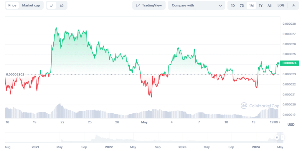 Prognozy średnich cen SHIB na 2024 rok wahają się od $0.0000117 do $0.0000323. Wg założeń AI mają szansę na wzrost w drugiej połowie roku. Jednak w przypadku negatywnych zmian rynkowych mogą spaść choćby do $0.00000750.