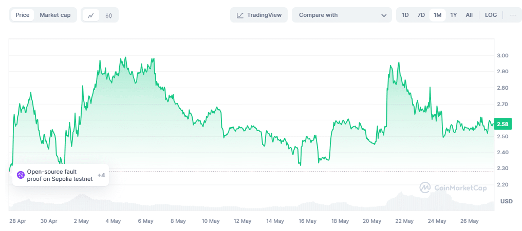 Optimism, pionierska 2 warstwa od Ethereum, czerpie korzyści z rosnącego zapotrzebowania na skalowalne rozwiązania blockchain. Na przestrzeni ostatniego miesiąca waluta odnotowywała wzrosty, aktualnie utrzymując się na stabilnym poziomie oraz cenie 2.58 USD.