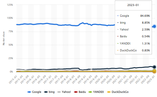 Ostatnio aktualizowane dane za styczeń 2023 nie pokazują znaczącej dynamiki spadku Google. Jednoczesnie przeglądarka nie była w stanie osiągnąć ponad 90% udziałów w rynku, osiągniętych w 2018 roku. Ale podobnie słabe i lepsze okresy za sobą ma Bing! Jego udział wygląda na śladowy – na tle Google. Dane pokazują jednak, iż w od 2020 zanotował blisko 35% wzrost, wobec 3% spadku Google. To jednak wciąż za wcześnie by mówić o jakiejkolwiek detrozniacji. Nie zapomnijmy także, iż Google dysponuje potężnym doświadczeniem i budżetem na badania oraz rozwój.