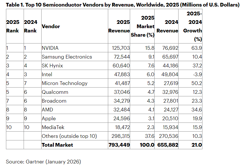 Największym beneficjentem tej zmiany jest NVIDIA, która w 2025 roku osiągnęła przychody na poziomie 125,7 mld dolarów, co oznacza wzrost o 63,9% w skali roku. Spółka zdobyła 15,8% udziału w globalnym rynku i odpowiadała za ponad 35% całkowitego przyrostu przychodów całej branży. To pierwszy raz, gdy NVIDIA przekroczyła próg 100 mld dolarów rocznych przychodów z półprzewodników.