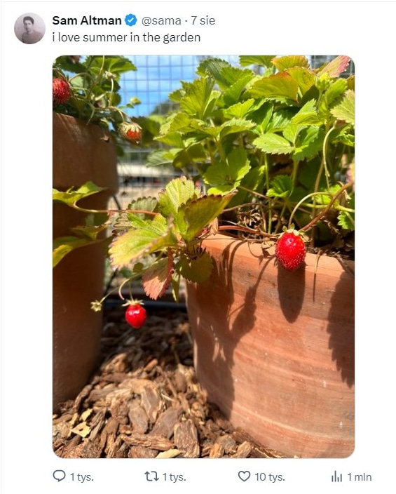 Chodzi o post Sama Altmana na temat należącego do biznesmena truskawkowego ogrodu. Został on opublikowany na platformie X w minioną środę.