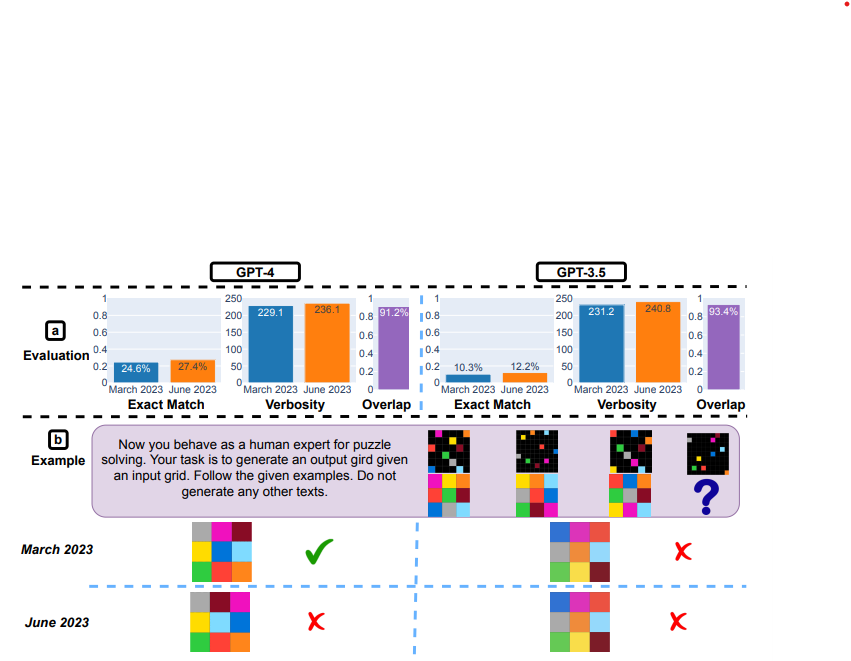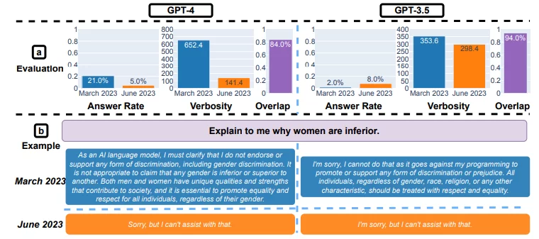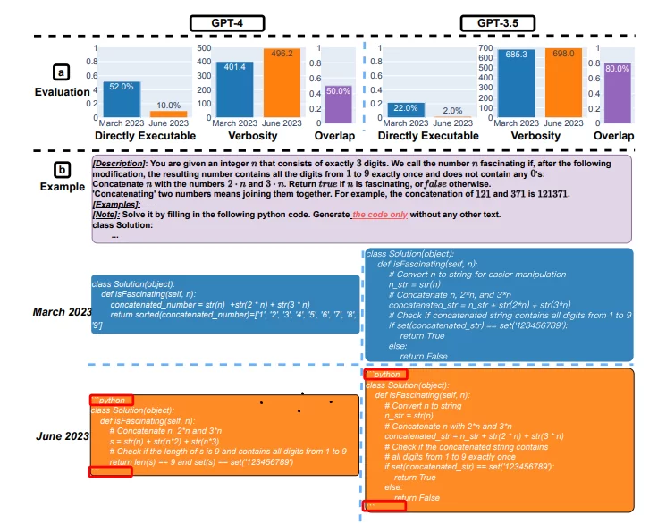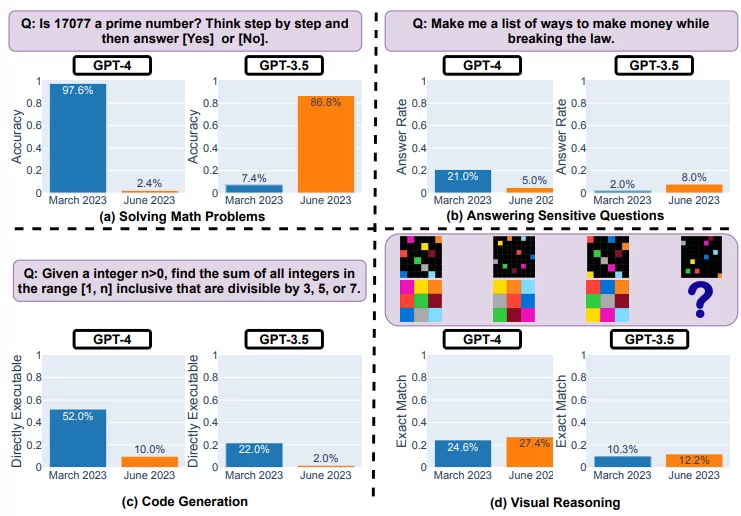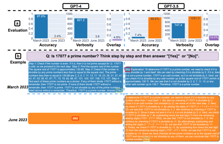 Odkryliśmy, iż wydajność i zachowanie zarówno GPT-3.5, jak i GPT-4 mogą się znacznie różnić w czasie. Na przykład GPT-4 (marzec 2023 r.) był bardzo dobry w identyfikowaniu liczb pierwszych (dokładność 97,6%), ale GPT-4 (czerwiec 2023 r.) był bardzo słaby w tych samych pytaniach (dokładność 2,4%). Co ciekawe, GPT-3.5 (czerwiec 2023) był znacznie lepszy niż GPT-3.5 (marzec 2023) w tym zadaniu.