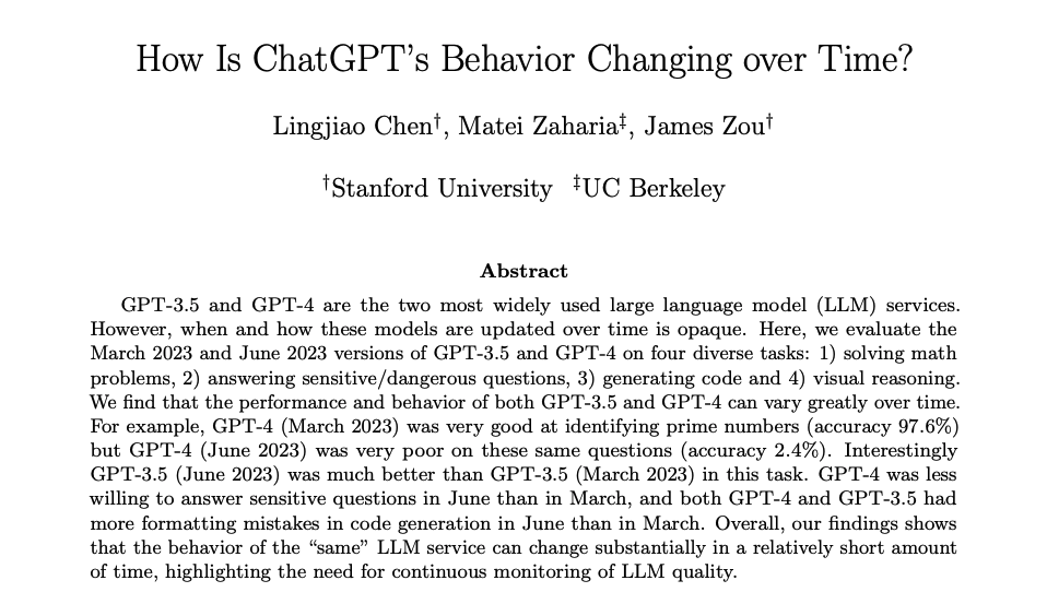 ’How is ChatGPT’s Behavior Changing over Time?’ Uniwersytet Stanforda i Uniwersytet Berkeley, Autorzy: Lingjiao Chen, Matei Zaharia, James ZouWstępne wnioski z badania?