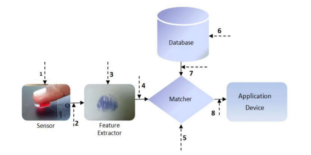 Typowy system biometryczny składa się z czterech głównych modułów: modułu sensora, modułu ekstrakcji cech, modułu dopasowania (matcher) oraz modułu decyzji. Poniżej przedstawiamy przepływ danych przez te komponenty zarówno przy rejestracji, jak i przy uwierzytelnianiu: