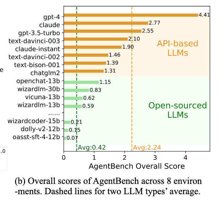 Wyniki testów (w 8 środowiskach) wybranych w badaniu modeli, z podziałem na API i Open-source. Przerywane line wskazują średnią wyników danej grupy. Źródło: arxiv.orgNaukowcy poszli choćby tak daleko, jak twierdzić, iż „najlepsze modele LLM stają się zdolne do radzenia sobie z złożonymi misjami w świecie rzeczywistym”.