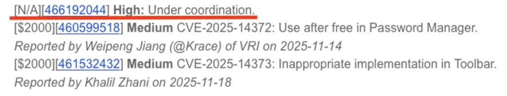 W chwili powstawania tego tekstu najnowsza luka typu zero-day w Chrome nie posiada identyfikatora CVE i nie jest jasne, którego komponentu przeglądarki dotyczy. Firma oznacza ją w tej chwili dzięki identyfikatora w systemie śledzenia błędów (466192044) i nadaje status „w trakcie koordynacji”.