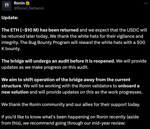 Ronin Network poinformowało, iż wcześniej tego dnia skontaktowały się z nimi „białe kapelusze” w sprawie potencjalnej luki w zabezpieczeniach mostu. Po zweryfikowaniu zgłoszenia most zatrzymano na około 40 minut po wykryciu pierwszej akcji w łańcuchu.