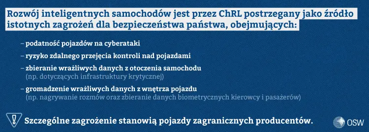 Ośrodek Studiów Wschodnich zwraca uwagę na takt, iż inteligentne auta coraz bardziej ułatwiają nam życie. Pozwalają na zdalne sterowanie, monitorowanie stanu pojazdu czy korzystanie z zaawansowanych funkcji sieciowych. Eksperci ostrzegają jednak, iż wraz ich rosnącą popularnością wzrasta także ryzyko cyberataków, wycieków danych, a choćby zdalnego przejęcia kontroli nad pojazdami. W raporcie OSW zwraca się także uwagę, iż szerokie wprowadzanie i promocja chińskich marek samochodów może stwarzać poważne zagrożenia dla bezpieczeństwa narodowego Polski.