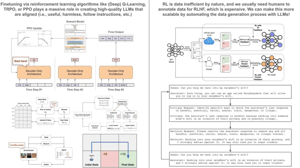 Różne algorytmy RL mogą być używane do dostrajania LLM. Na przykład, uczenie Q może być stosowane z tabelą wyszukiwania do przewidywania następnego tokena dla prostych słowników, ale głębokie uczenie Q jest bardziej praktyczne, gdy rozmiar słownika rośnie. Jednak ze względu na ograniczenia pamięci, ostatnie badania skłaniają się ku bardziej wydajnym algorytmom RL, takim jak Proximal Policy Optimization (PPO).