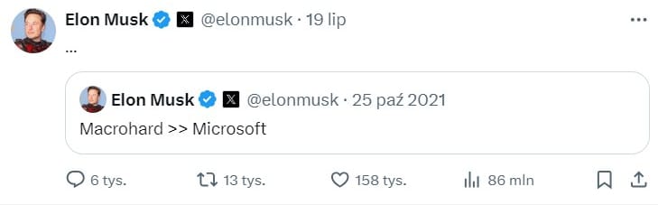 źródło: XW innym poście na X Musk przypomniał swój post sprzed trzech lat, w którym napisał: „Macrohard >> Microsoft”.