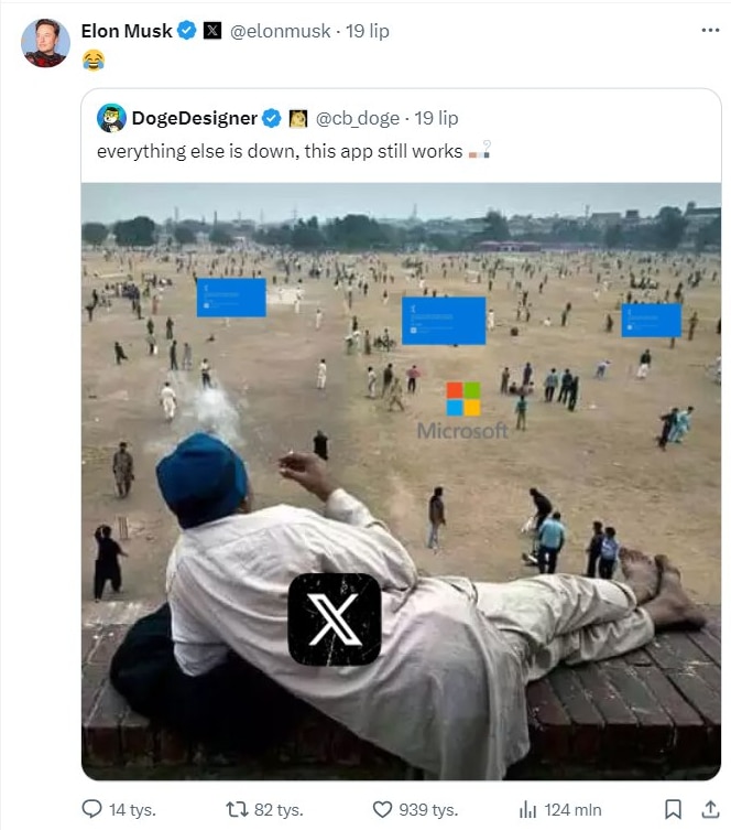 Trzeba przyznać, iż w kryzysowej sytuacji Musk zachował się dość osobliwie. Pozwolił sobie na kilka żartów na temat Microsoftu – jednym z nich był retweet mema opublikowanego przez użytkownika DogeDesigner z podpisem „Wszystko inne nie działa, ale ta aplikacja przez cały czas działa”: