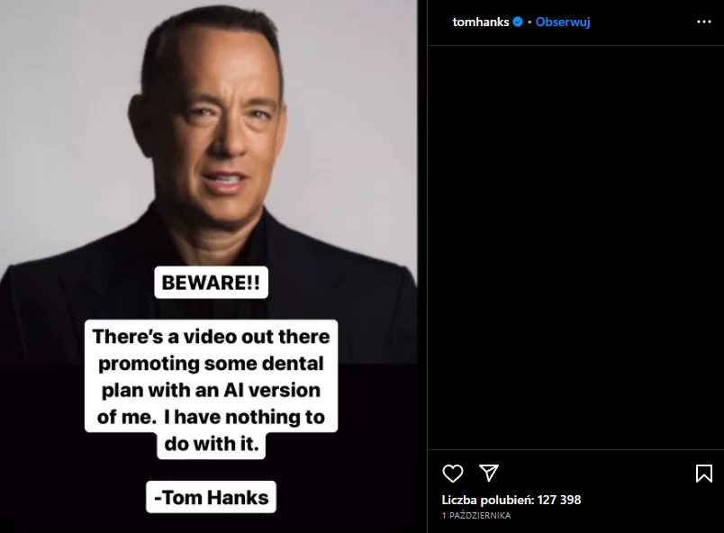 Tom Hanks ostrzega przed technologią deepfake
