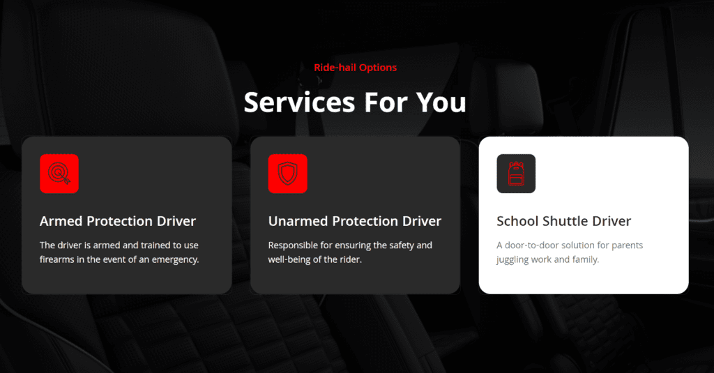 Firma oferuje ride-sharing w trzech wariantach: Unarmed Protection Driver (z „nieuzbrojonym” kierowcą wyposażonym w gaz pieprzowy i pałkę), Armed Protection Driver (z kierowcą wyekwipowanym w pistolet lub także karabin) oraz School Shuttle Driver (usługa wykraczająca poza jedynie transport samochodem, obejmująca eskortę „od drzwi do drzwi” i dedykowana rodzinom oraz rodzicom dzieci). Na dodatkowe życzenie możliwe jest także zorganizowanie transportu z wykorzystaniem opancerzonego samochodu.