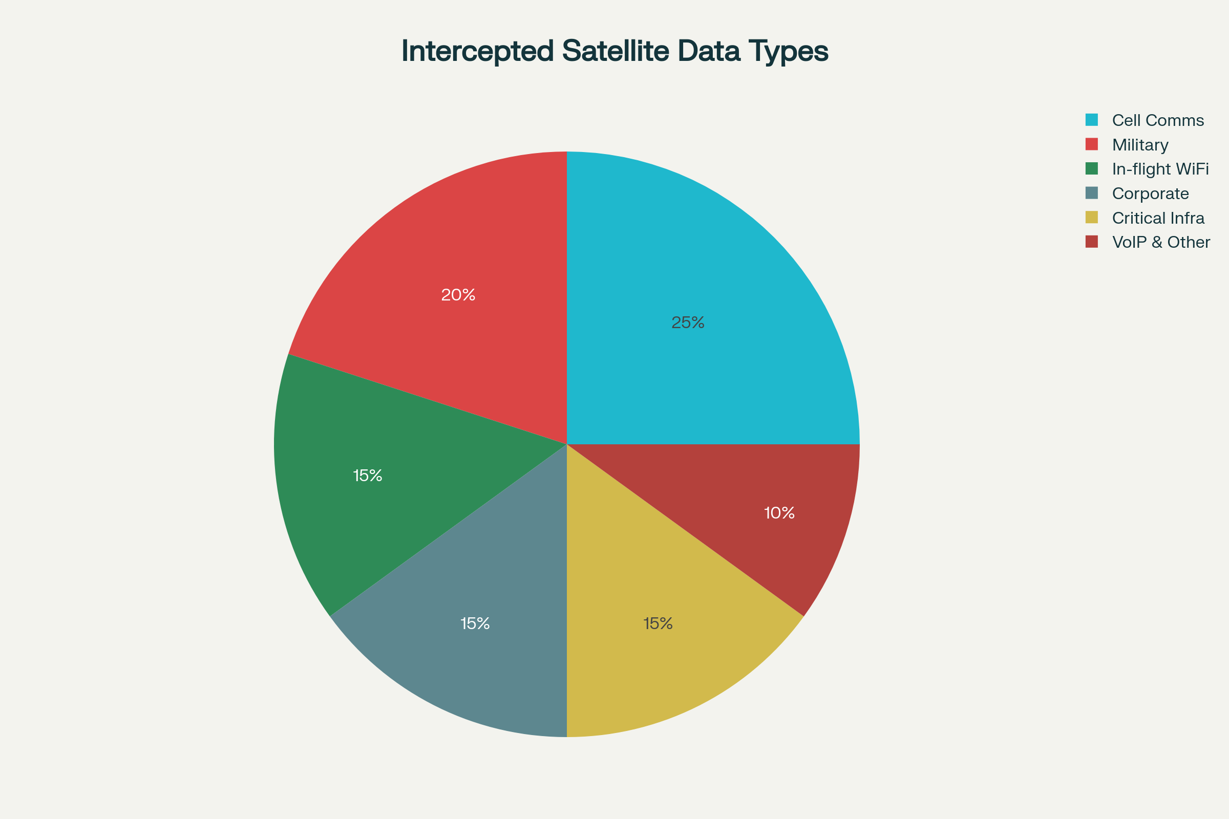 Komunikacja VoIP od wielu dostawców używała niezaszyfrowanego satelitarnego łącza szkieletowego satelitarnego, ujawniając niezaszyfrowany dźwięk rozmów i metadane użytkowników końcowych. Przedsiębiorstwa detaliczne, finansowe i bankowe używały niezaszyfrowanej komunikacji satelitarnej dla swoich sieci wewnętrznych. Badacze zaobserwowali niezaszyfrowane dane logowania, firmowe e-maile, rekordy inwentaryzacji i informacje sieciowe bankomatów.