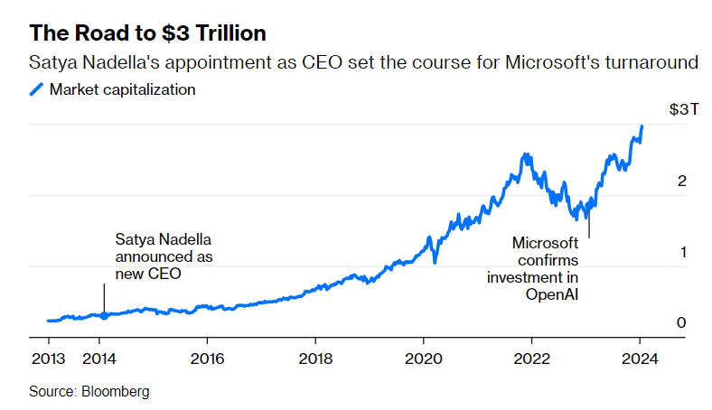 Inwestorzy z opóźnioną euforią zareagowali, na realizowane od 2019 roku inwestycje Microsoftu w AI. Odkąd CEO spółki, Satya Nadella objął dowództwo, kapitalizacja rynkowa Microsoftu wzrosła 15-krotnie. Dokładnie 10 lat temu rynek euforycznie wyceniał biznes Apple i 'iPhone’owe’ nowości. Poprzedni CEO spółki kojarzonej z Windowsem sceptycznie patrzył na Apple, przez co Microsoft uznany został za marudera. Nadella, który prowadził dział chmury obliczeniowej, wziął sprawy w swoje ręce i ze spółki kojarzonej z oprogramowaniem, przekształcił Microsoft w giganta sektora chmury obliczeniowej, gdzie firma powoli zwiększa udziały w rynku.