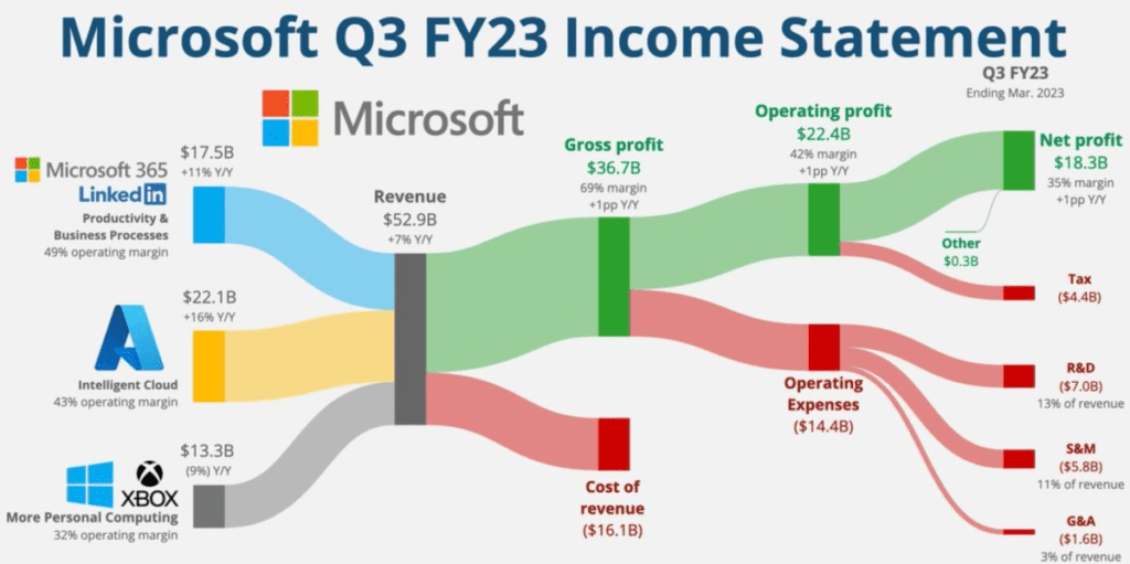 A Microsoft? W ostatnim raportowanym kwartale Microsoftu (Q3 2023), żaden pojedynczy produkt ani usługa nie przyniosły więcej niż 40% przychodów w wys. 56,5 mld USD. Największa część pochodziła z Azure, która (23 miliardy dolarów). Usługi Office 365 wygenerowały 13,1 mld USD, a Windows 5,6 mld USD. Linkedin i pozostałe przejęcia ok. 3,9 mld USD. Do tego Xbox przyniósł 3,9 miliarda dolarów (niebawem możliwe połączenie z Activision Blizzard i uderzenie w dominację Sony. Dodajmy do tego 49% udziałów w OpenAI (GPT) oraz zabierające rynek computing AWS, Microsoft Azure i mamy mocny lewar na poprawę zysków netto i przepływów pieniężnych. Microsoft dysponuje świetnie rozdzielonym modelem biznesowym, ale… Nie miejmy złudzeń, model ten także jest cykliczny (i podatny na ew. recesję).