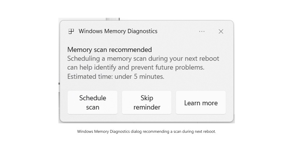 W nowej wersji systemu Windowsa 11 pojawiła się przydatna opcja, która pozwala na skanowanie pamięci w poszukiwaniu problemów, gdy pojawi się niebieski ekran śmierci (BSOD). W trakcie następnego uruchomienia komputera jeszcze przed ekranem logowania pojawi się powiadomienie sugerujące szybkie skanowanie pamięci.