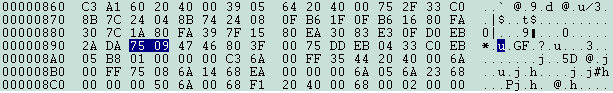 Zadaniem crackera jest odnalezienie w pliku programu opkodów instrukcji JNZ 0040129D. Jest to możliwe dzięki temu, iż SoftIce pokazuje wszystkie opkody instrukcji w programie. Czyli szukaną wartością będą dwa bajty: 7509 hex, ta wartość jest opkodem instrukcji JNZ 0040129D. W praktyce poszukuje się większej ilości bajtów, ponieważ bajty 7509 hex. mogą w programie występować wielokrotnie. Dlatego podając w hexedytorze poszukiwane bajty, wpiszemy również po dwa opkody sąsiadujące z poszukiwanymi bajtami. Wpisujemy 2ADA 7509 4746 i edytor, automatycznie podświetla znalezione wartości. Aby można było je zlokalizować w programie należy otworzyć plik CrackMe2 w hexedytorze.
