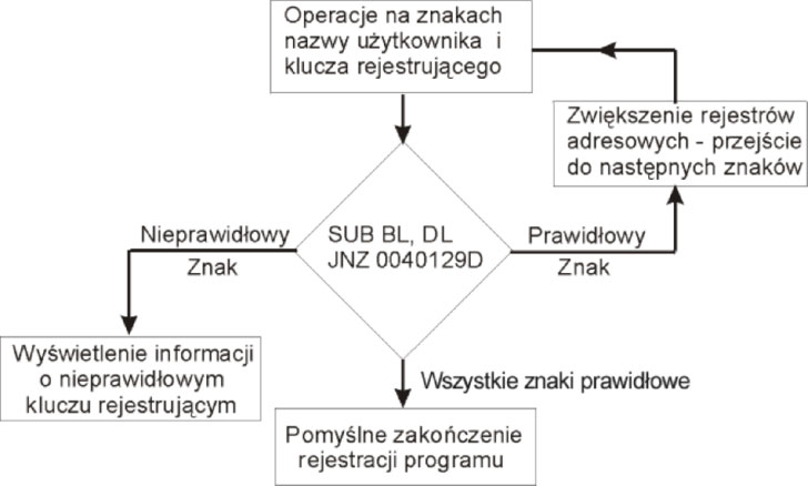 Kolejna instrukcja jest kluczowa dla procesu rejestracji. Instrukcja JNZ 0040129D to skok do procedury z informacją o niepoprawnej rejestracji. Skok zostanie wykonany tylko wtedy, gdy w rejestrach BL i DL będą różne wartości. Dla nas oznacza to, iż odkryliśmy sposób, w jaki powstaje klucz rejestrujący oraz zależność między nim, a nazwą użytkownika. Dzięki temu wiemy jak dla danego użytkownika stworzyć klucz. Każda litera z nazwy użytkownika ma przypisaną cyfrę reprezentującą ją w kluczu rejestrującym. Nie trudno policzyć kolejne cyfry odpowiadające znakom z nazwy użytkownika, ponieważ: np.: litera „b” to w standardzie ASCII - 62 hex. i 0110 0010 binarnie. Instrukcja AND BL, 0F zeruje pierwsze cztery bity, więc otrzymujemy, 02 hex i 0000 0010 binarnie, po przesunięciu bitowym w prawo o jedną pozycję (instrukcja SHR BL, 01) otrzymujemy 0000 0001, czyli cyfrę 1. Aby zamienić tą cyfrę na znak 1 zapisany w standardzie ASCII należy do niej dodać dokładnie tyle ile zostało odjęte od rejestru DL, czyli 30 hex. W rezultacie dla litery „b” otrzymujemy 31 hex, czyli cyfrę 1. Należy pamiętać, iż program nie rozróżnia małych i wielkich liter, więc dla litery „B” cyfrą w kluczu również będzie 1. Instrukcja JNZ 0040129D jest decydującą w porównaniu znaków nazwy użytkownika i klucza rejestrującego. Kolejne instrukcje są odpowiedzialne za zwiększenie rejestrów z adresami nazwy użytkownika i klucza oraz za skok do początku listingu 3. W przypadku, kiedy klucz rejestrujący jest poprawny, operacje z listingu 3, są wykonywane tyle razy ile jest znaków w nazwie użytkownika. Przerwanie pętli następuje, kiedy znak klucza nie odpowiada znakowi nazwy użytkownika lub gdy zostały sprawdzone wszystkie znaki nazwy użytkownika. Znakom nazwy użytkownika, przyporządkowane są następujące cyfry klucza: