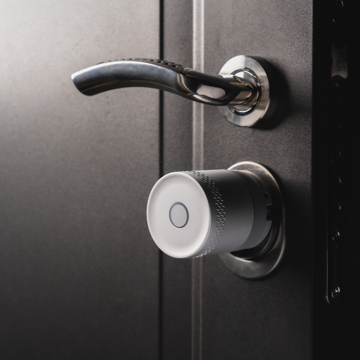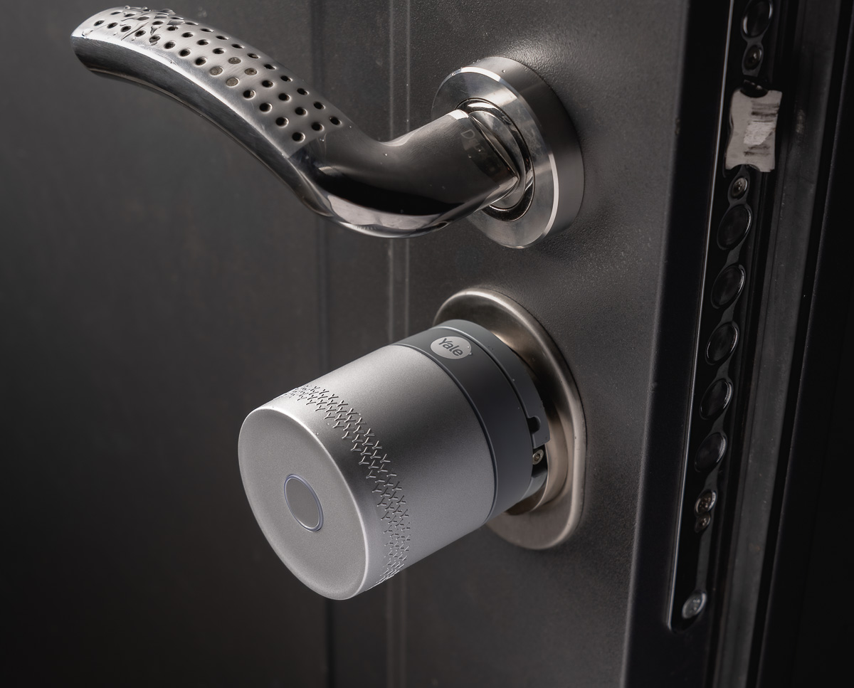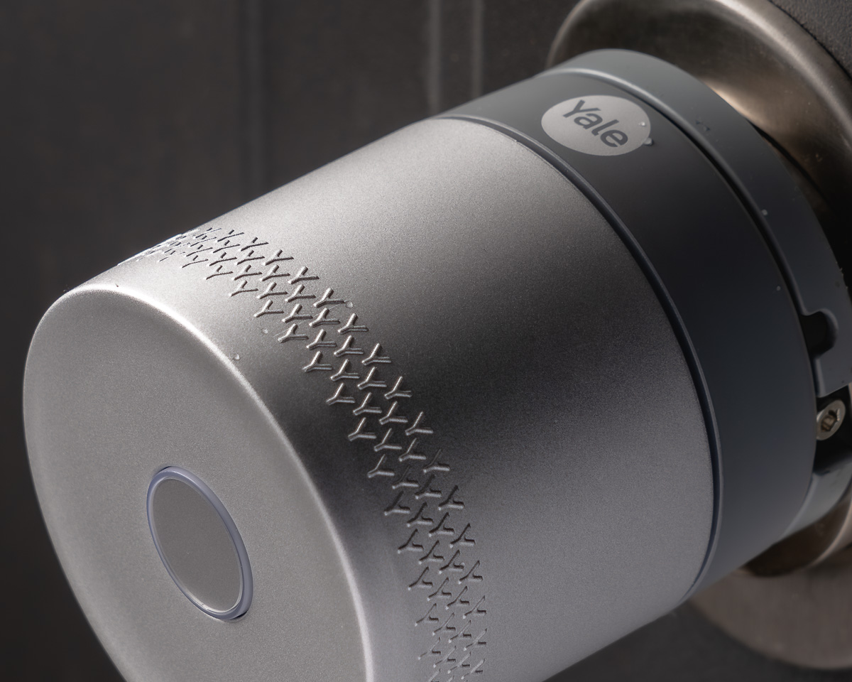I to jest ten niewielki przycisk, który widzicie na zdjęciu powyżej. Yale nazwało to KeySense, ale nie musicie się uczyć tej nazwy – od strony użytkowej jest to po prostu przycisk, którego naciśnięcie znosi z nas ciężar kręcenia gałką. Jedno kliknięcie – zamek sam sam się zamyka. Jedno kliknięcie – jeżeli był zamknięty – otwiera się. Dodatkowo można ustawić jeszcze akcję dla dłuższego przytrzymania przycisku, dzięki czemu po takim działaniu zamek zamknie się przykładowo po 20 sekundach – czyli po czasie, kiedy np. zdążymy już wyjść z domu i zatrzasnąć za sobą drzwi.