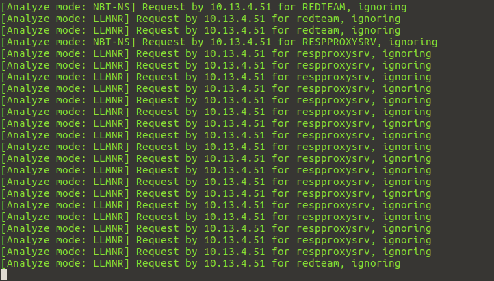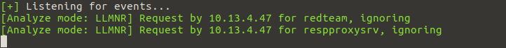 Responder is simply a LLMNR, NBT-NS and MDNS poisoner, with built-in HTTP/SMB/MSSQL/FTP/LDAP rogue authentication server supporting NTLMv1/NTLMv2/LMv2, Extended safety NTLMSSP and Basic HTTP authentication. Oprogramowanie to w skrócie pozwala na wykradzenie hashy haseł w infrastrukturze Windowsowej, a co z kolei jest pierwszym krokiem w atakach przeprowadzanych w lokalnej sieci. Jeśli więc odwiedzimy w Windowsie adres, który nie istnieje, np. http://redteam/ to stacja zaczyna wysyłać zapytania m.in. protokołem LLMNR. Możemy to zobaczyć wykorzystując w/w program w trybie analizy (przełącznik "A"):