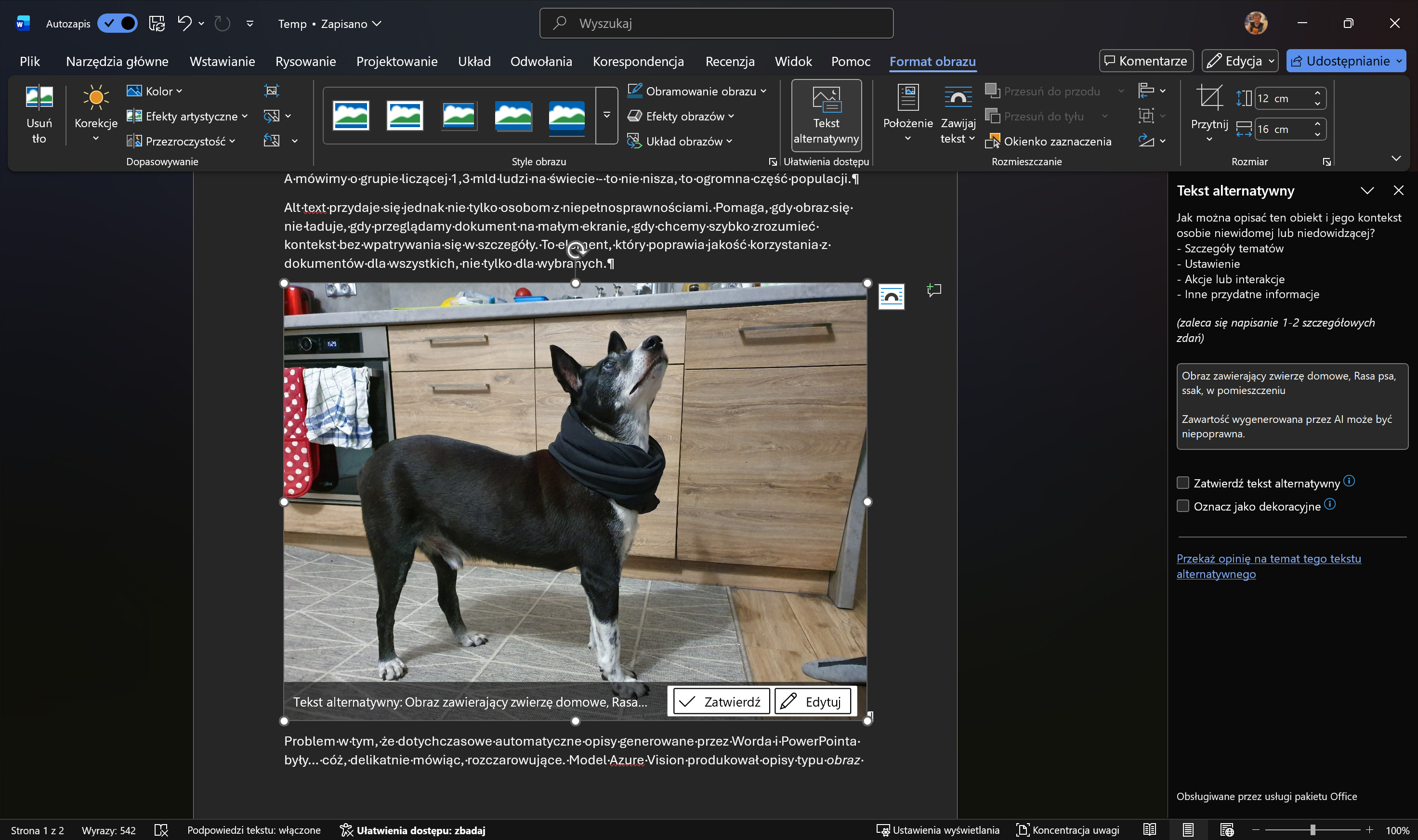 Wygenerowany tekst: obraz zawierający zwierzę domowe, rasa psa, ssak, w pomieszczeniuNowy system generowania alt textu działa w dwóch trybach – zależnie od tego, czy korzystasz z komputera klasy Copilot+, czyli najnowszych laptopów z dedykowanymi procesorami NPU. W tym wariancie dzieje się magia. Gdy wstawiasz obraz do Worda lub PowerPointa generatywna AI tworzy opis lokalnie, bez wysyłania czegokolwiek do chmury. Wszystko dzieje się na twoim urządzeniu, w ułamku sekundy, z pełnym poszanowaniem prywatności.