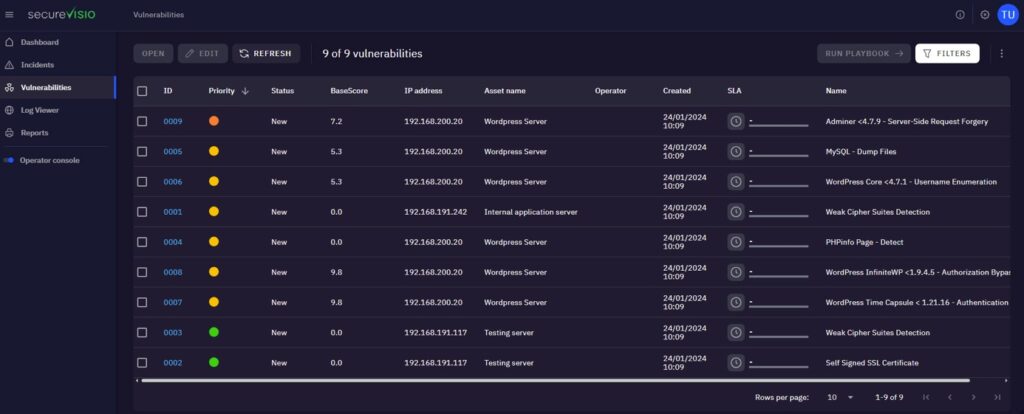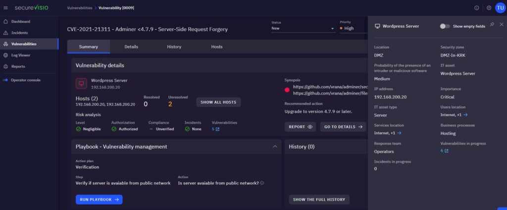 SecureVisio pokazuje automatycznie priorytetyzuje podatności w oparciu o unikalny profil ryzyka – prezentując jednocześnie najważniejsze informacje, takie jak adres IP czy nazwa aktywa (np. serwer WordPress).
