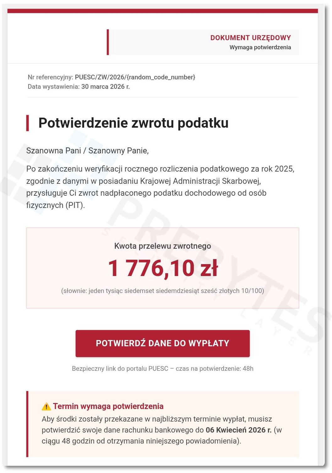 Wektorem tego ataku są odpowiednio przygotowane wiadomości e-mail. Oszuści podszywają się pod Krajową Administrację Skarbową (KAS) i wysyłają fałszywe wiadomości informujące rzekomo o przyznaniu zwrotu podatku za rok 2025. Zachęcają do potwierdzenia danych potrzebnych do realizacji wpłaty, obiecując szybki zwrot nadpłaty PIT. W tym celu wykorzystują zarówno wizerunek platformy PUESC, jak i adresy e-mail sugerujące powiązania z administracją publiczną.