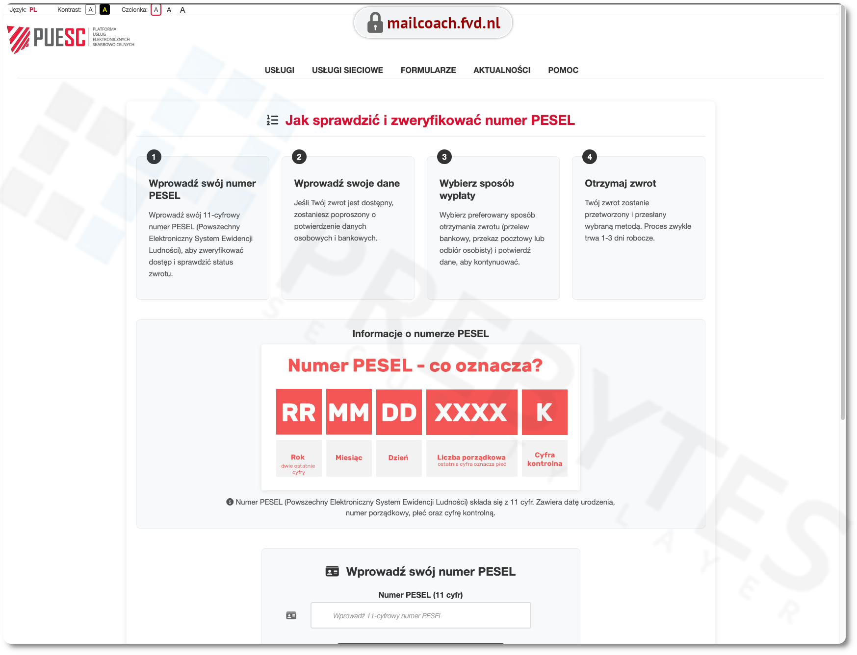 Strona docelowa wiernie imituje interfejs portalu PUESC, wykorzystując oficjalne logotypy i kolorystykę. Istotnym elementem zwiększającym wiarygodność jest zastosowanie instrukcji o „weryfikacji PESEL”, uzupełnionej o wizualizację struktury numeru. Zabieg ten imituje procesy znane z legalnych systemów administracji publicznej, co dodatkowo obniża czujność użytkownika.