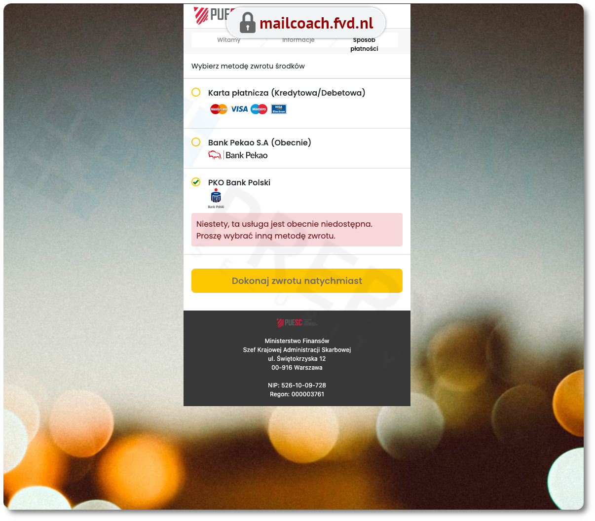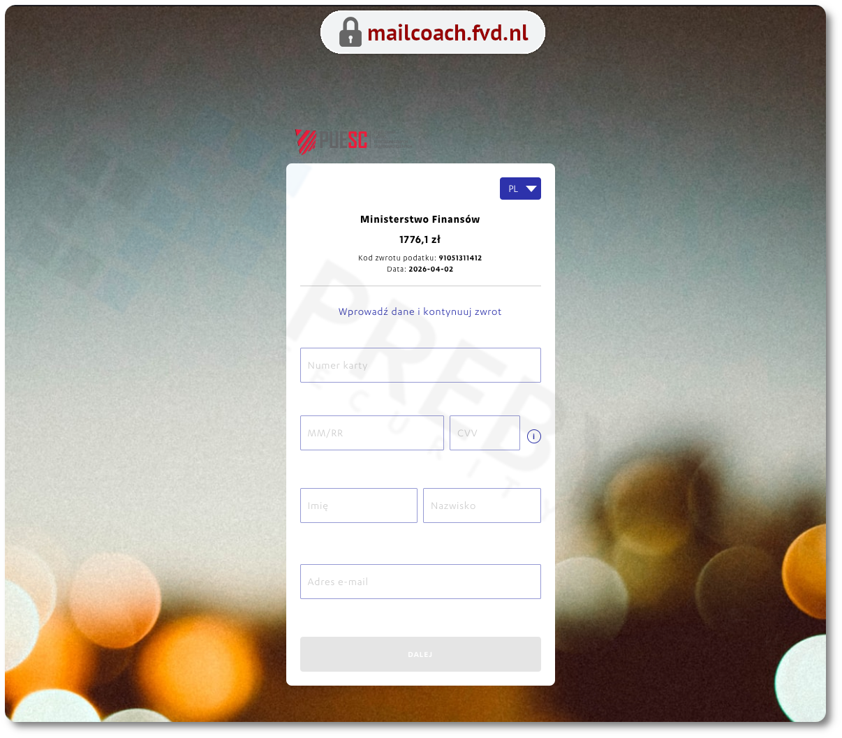 Scenariusz ataku bazuje na dobrze znanym mechanizmie „zwrotu podatku”, jednak został wzbogacony o realistyczne elementy wizualne oraz wieloetapowy proces wyłudzenia danych.