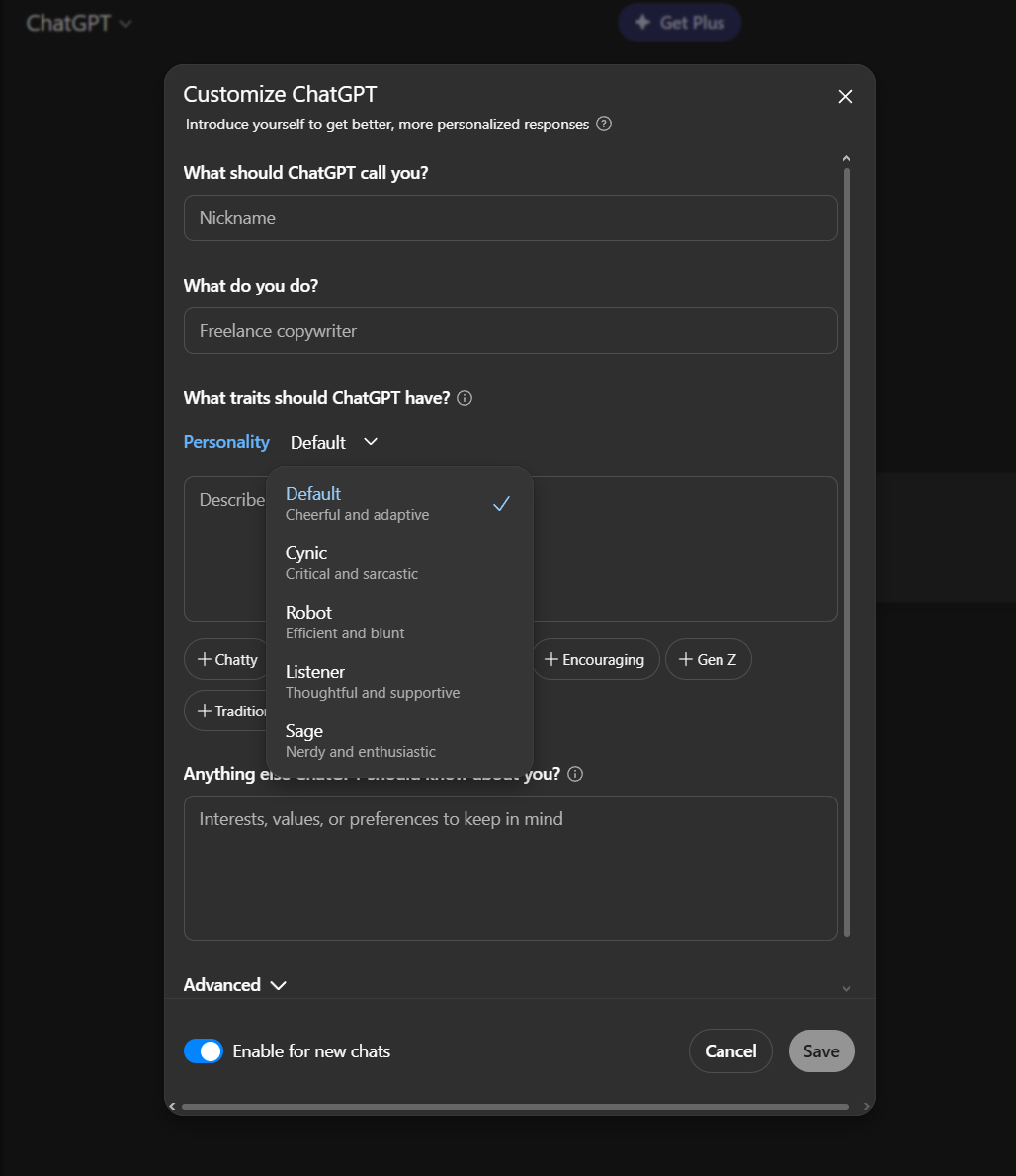 OpenAI wprowadza nowy poziom personalizacji w ChacieGPT, umożliwiając użytkownikom wybór stylu, w jakim AI prowadzi rozmowę. W sekcji „Personalizuj ChatGPT” pojawiły się cztery gotowe „osobowości”: Robot – precyzyjny i konkretny, Cynik – sarkastyczny i zdystansowany, Słuchacz – wspierający i empatyczny, oraz Mędrzec – entuzjastyczny i erudycyjny. Każda z nich wpływa na ton i sposób interakcji, ale nie zmienia funkcji pamięci ani zbierania danych.