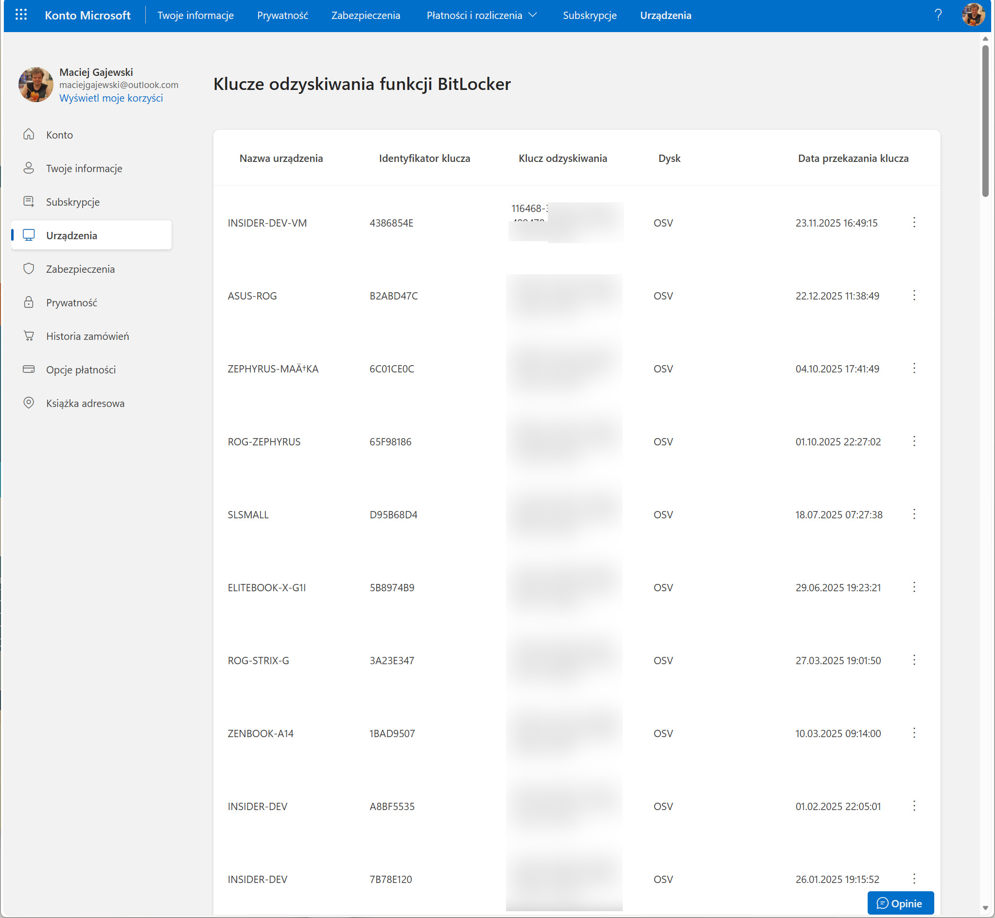 - Sprawdź, czy twój klucz jest w chmurze. Wejdź na: https://account.microsoft.com/devices/recoverykey. jeżeli widzisz tam klucz – możesz go usunąć. Choć tu dla porządku przypominamy, iż wedle argumentacji Microsoftu w razie awarii komputera użytkownik ma kopię zapasową klucza w teoretycznie bardzo bezpiecznej chmurze, do której zawsze ma dostęp. Faktycznie, jest to bardzo wygodne, może w niektórych przypadkach uchronić przed permanentną utratą dostępu do danych.
